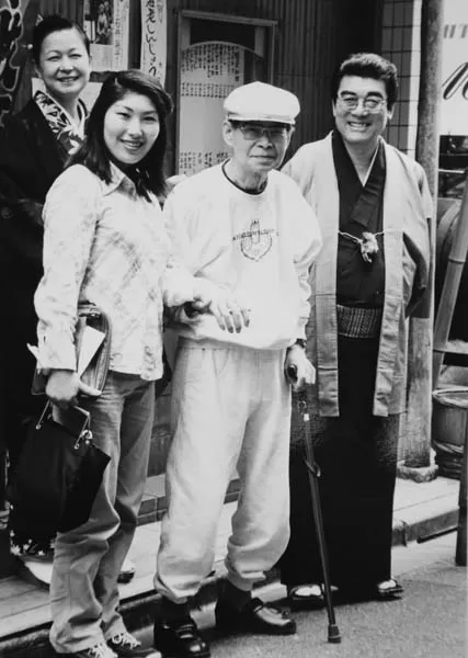 もう一枚は一門を語るのに欠かせない、師匠の2代目神田山陽が写ったもの。場所は閉館した本牧亭前。私服のまま杖をついて写っているのが山陽だ。山陽は戦前の大手の書籍取次のひとつ「大阪屋号書店」の跡取り息子であった。