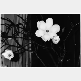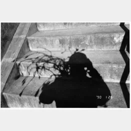 陽子が入院していた病院から容態が急変したと電話があって、急いで駆けつけて行ったんだけど、いつも行く近道の階段の前の角に花屋があるの。いつも花を買ってた花屋なんだ。そこで、まだ蕾のこぶしの花を買って、その近道の階段を上がるときにオレの影を写したんだ。そんな冷静なわけじゃないんだけどね。だから、この写真は死に向かっている妻に会いに行く階段なんだ。まだ蕾のこぶしの花の影も写ってる。それから何時間か後に妻は死ぬんだけど、死んだときに、このこぶしの蕾がパッと咲いたんだよ。そのあたりから、オレの花を撮るということが本当に始まったんだ(陽子は1990年1月27日に子宮肉腫のため42歳で他界した)。
