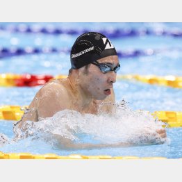 「さあ、競泳200メートル個人メドレー決勝、今スタートしました。萩野公介選手は第2コースです……泳いでいます……水をかきました……ターンをしましたね………残りわずかです……萩野選手今先頭で入りました……以上東京オリンピック競泳200メートル個人メドレー決勝でした」