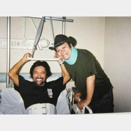 「面会謝絶だよ!」と僕が言うと、あの笑顔といつもの調子で「そんなこと言うなよ~」と。西やんとの付き合いは古くて本当に親友。写真にあるように首にコルセットを巻いてる状態なのに、僕の病室まで駆けつけてくれた。ちゃんと歩けるようになるのか、芸能界に復帰できるのかと一番不安な時だったから、すごくうれしかった。友という存在に勇気をもらえたね!
