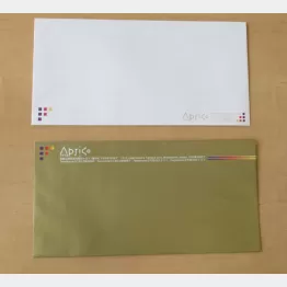 野崎幸助さんの遺言が入っていたという封筒を印刷した会社で、応対してくれた社長と一緒に応接室で待っていると、従業員の方がビニール袋に入った金色のアプリコの社封筒を手にしてやってきた。