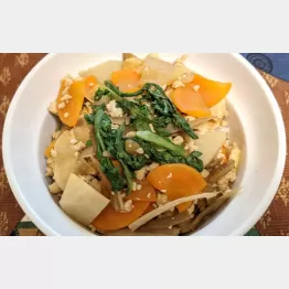 これは私のふるさと岡山の郷土料理で、冬になると食卓に出てくる家庭料理です。淡水魚の鮒で作ります。まず、ミンチにした鮒を炒めてそぼろ状にします。材料は薄くいちょう切りにした大根とニンジン、ささがきにしたゴボウで、ゴボウはあくを取っておきます。それから小さめの乱切りにした里芋、お揚げは細切りに。これらを鮒のミンチの中に入れて炒め、水とお酒と醤油とみりんで味を調え、最後に春菊を散らします。スープのように召し上がる家庭もあるようですが、ウチではご飯の上にのせて丼のようにしていただきました。