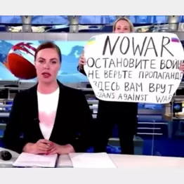 ロシアの独立系メディアによると、女性は「チャンネル1」の編集スタッフ。看板番組「ブレーミャ」の放送中、ニュースを伝えるキャスターの背後に立つと、ロシア語と英語で書かれたメッセージを掲げながら「戦争をやめて」と訴えた。