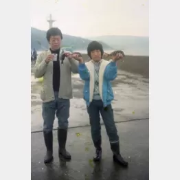 その唐さんと看板女優だった李麗仙さんの長男が、俳優で作家の大鶴義丹。劇団に入った時、オレは23歳で義丹はまだ9歳だったから、釣りに連れて行ったりしたよ。これは唐さんと3人で伊豆に行って、唐さんがオレと義丹を撮った写真。オレの髪もまだフサフサだった頃(笑)。この写真では海風に吹かれてクルクルしてるけど、オレの髪はもともとストレートなんだよ。