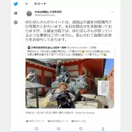《あの場所って久留米成田山分院だと思うのですが 住職さんはいらっしゃっても神主さんって居ないんですよね…煽り文句に成田山の住職(?)の言葉を使われるなんて 久留米市民としては黙ってはいられないんで 明日、成田山にゆたぼんのツイートを見てもらって確認しに行ってきます》