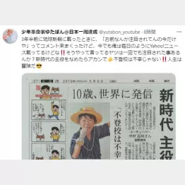 "少年革命家"を名乗る、不登校YouTuberのゆたぼん(13)が24日、ツイッターを更新。自身が取り上げられた過去の記事を添付し、『3年半前に琉球新報に載ったときに、「お前なんか注目されてんの今だけや」ってコメント来まくったけど、今でも俺は毎日のようにYahoo!ニュース載ってるけどな そうやって言ってるヤツは一回でも注目された事あるんか? 新時代の主役をなめたらアカンで 不登校は不幸じゃない 人生は冒険だ』と投稿した。