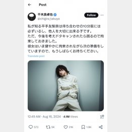 歌手のAdoが所属する芸能事務所「クラウドナイン」代表取締役社長の千木良卓也氏が16日、自身のX(旧ツイッター)を更新。元欅坂46で女優の平手友梨奈(23)の"拘束写真"とともに、「私が知る平手友梨奈は待ち合わせの10分前には必ずいるし、他人を大切に出来る子です。ただ、今後を考えドタキャンされたら困るので拘束しておきました。彼女はいま健やかに拘束されながら次の準備をしていますので、もうしばらくお待ちください」と投稿。同事務所移籍を示唆している。