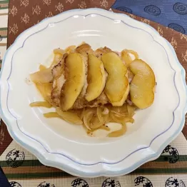 ③同じフライパンに白ワイン、塩コショウを加えて中火にかけ、焦がさないよう木べらなどでかき混ぜながら煮詰める。とろみがついたら豚肉とリンゴを盛り付けた皿の上から回しかける。
