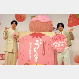 SixTONESの松村北斗(29)とKing & Princeの髙橋海人(26)が10日、都内で行われた丸亀製麺「丸亀うどーなつ」新商品・アンバサダー発表会に出席した。