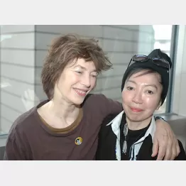 この写真は15年前の「フランス映画祭2010」にジェーン・バーキンが団長としてやってきた時のもの。バーキンは63歳。ご覧のようにこの時のバーキンはボーイッシュなショートへアもナチュラルなまま。前歯にちょっとスキ間があるのですが、フランスではそれがカッコいいって言われています。着ているのはTシャツで、彼女はスカートよりパンツ姿が多いですね。そして、私をハグし、肩を抱いてくれたのがこの写真です。