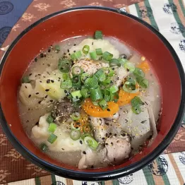 母親はホットケーキもジャガイモの天ぷらもそうですが、小麦粉をよく使っていた。郷土料理のだご汁もよく作ってくれました。小麦粉を練ってちぎって味噌汁に入れるんですよ。九州の定番メニューで、これが僕のおふくろメシと言えるのかな。僕の地元ではだんごを“だご”と呼びます(大分県ではだんご汁、九州では一般的にだご汁)。