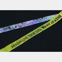 「銀テープ」(写真)とは、コンサート中に“キャノン砲”で客席に飛ばされるもので、ツアー名やメッセージがプリントされている。最近ではこれをキーホルダーにする専用のケースもあり、記念の品として楽しんでいるファンも多い。今回、嵐のコンサートでは、表にツアー名、裏面にはこれまでのツアーロゴが小さくプリントされ、嵐の歴史を振り返ることができる。ファンにとってはお金に換えられないアイテムだ。