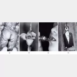 これは、水に浮かぶ女性のお尻だね(②)。やっぱり花はエロティック、花陰はいいねぇ(③)。蛇口から出る水も、ストロボだと水がこういう形になるんだよ(④)。この宙から吊られているのは、名作「妻が逝って首吊り自殺したA」、オレのオブジェの第一号だね(⑤)。これはね、陽子がいつも使ってた、フランスパンを切ってた台だね。そのパン切りまな板に色を塗って、取っ手のところがオレの顔で、彼女の陰毛を髪の毛にしたの。で、紐は彼女の着物の帯なんだよ。