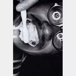 この写真、おもしろいだろ。『エロトス』(1993年刊写真集)に入れた写真で、歯磨きしているセルフポートレートなんだよ(①)。リングストロボの形が予想以上にまんまるで、おまけに輪っかの中にもうひとつオマケがあって、嬉しかったね。偶然が味方してくれたんだよ。