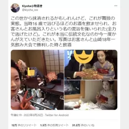 元舞妓・桐貴清羽のツイッターが話題になっている。「当時16歳で浴びるほどのお酒を飲ませられ、お客さんとお風呂入りという名の混浴を強いられた」「5000万円で処女を売られそうになった」など“京都花街のヤミ”を告発したのだ。