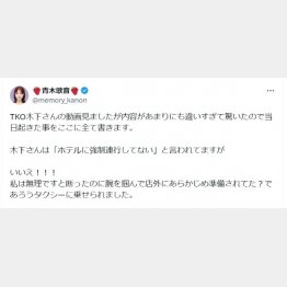 元女子アナ青木歌音がTKO木下と「ホテルに連行」事件を巡り対立も…もう一人の"性加害"芸人もヒント拡散で戦々恐々
