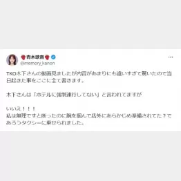 元女子アナでYouTuberの青木歌音(32)が1月30日、自身のXを更新。《TKO木下さんの動画見ましたが内容があまりにも違いすぎて驚いたので当日起きた事をここに全て書きます》と投稿した。