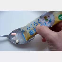 用意するのは大きめのスプーン。それにゼリーを少し出し、中央付近に薬をのせたら、さらにゼリーをかけて薬を覆う。あとは飲むだけ。ゼリーは細かく砕かれたレモン味でおいしい。つい咀嚼したくなるが、それをこらえて一度に飲み込む。少し苦労したが、水で飲むと喉の途中で薬が残るあの違和感が、これにはない。つるんとしたのど越しだけでなく、胃までの到達時間も実は水より早いという。