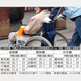厚労省の統計によれば、2013年の時点で、全国に6212施設、収容定員は約45万人となっています。ただし、圧倒的に不足しているのはご存じのとおり。要介護が増える75歳人口1000人当たり、28.2人分しか用意されていない計算になります。しかも、都道府県でかなりの差があります。最も多いのが福井県の38.1、最低が愛知県の23.2。その差は1.6倍です。表には首都圏、関西圏、中京圏の各県の数字をまとめておきました。