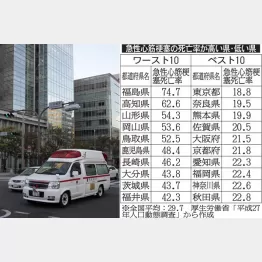 〈表〉は都道府県単位で見た、2015年の急性心筋梗塞による死亡率ワースト10、ベスト10をまとめたものです。