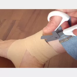 きつく巻いたテーピングは肌との間に隙がなくテーピングを切る際、ハサミの先が肌に刺さりそうになる。今回は、その不安を軽減するテーピング用ハサミを試してみた。貼るタイプの包帯や緊急時の衣服カットにも適しているとうたっている。