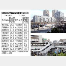 表は首都圏(東京・神奈川・千葉・埼玉)の男性の、ワースト10とベスト10をまとめたものです。人口が少ないと誤差が大きくなるため、町村は除いています。また、数字は平成20~24年の5年間の平均値になっています。
