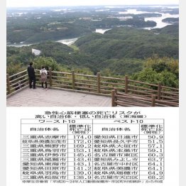 東海三県(愛知県・岐阜県・三重県)は、急性心筋梗塞で亡くなるリスクがさほど高くありません。とくに愛知県は全国平均よりも低めになっています。域内の急性心筋梗塞の標準化死亡リスク(男性)ワースト10とベスト10を〈別表〉にまとめました。標準化死亡リスクは年によって変動しますが、数字は2008~12年の5年間の平均値です。また町村は人口が少なく、誤差が大きいため除いています。