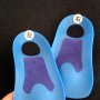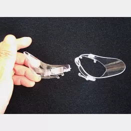 商品自体は少し硬めのシリコーンリングで、目の周りにフィットするように端の方が伸びた形をしている。上下に小さいフックがあり、メガネフレームの内側からひっかけられるようになっている。