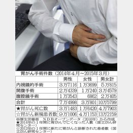 〈表〉は2014年度の手術数をまとめたものです。胃がんの手術には、「内視鏡」「開腹」「腹腔鏡」の3種類があります。問題は内視鏡です。