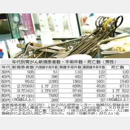 胃がんには放射線や抗がん剤があまり効きません。そのため、積極的に手術を行います。たとえば70代の新規患者約3万3000人に対して、手術件数の合計は約3万1000件。ほとんど全員が手術を受けた計算になります。