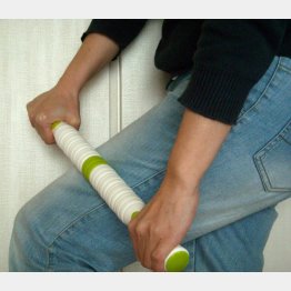 鉄の軸に9個のポリプロピレン素材の輪っかが付いた長さ47センチの棒は重さ250グラムで、持った感じは軽い印象だ。まずは、両端にある持ち手を握り、麺棒で麺をのばすがごとく椅子に座ったまま太ももに押し付けながら転がしてみる。