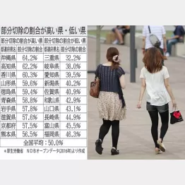 手術を受ける女性にとって、部分切除か全切除かは切実な大問題。全国平均で見ると、ちょうど半々になっています。しかし、ここでも大きな都道府県格差が表れています。各県の部分切除の割合を計算し、〈表〉にまとめました。