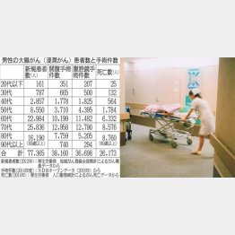 内視鏡で取れない大腸がん(浸潤がん)は、開腹ないし腹腔鏡手術で切除することになります。男性の年齢別患者数、手術件数、死亡数を〈表〉にまとめました。