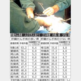 死亡率の高さは、肝臓がん患者の多さを反映しています。そのため、肝臓がんの手術件数も「西高東低」の傾向が見られます。〈表〉に手術件数(人口10万人対)の多い県、少ない県をまとめました。