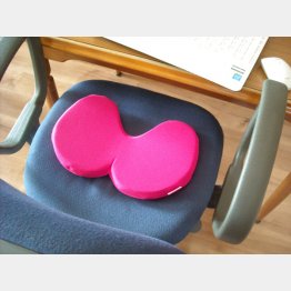 形は、お尻形で、厚みは最大2.5ミリ。ポイントは前下がりの微妙な傾斜がついていること。椅子に置いて座ると、自然に骨盤が立ち上がり、正しい姿勢になる仕組みだ。
