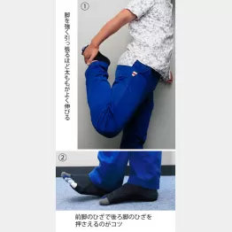 「とにかく脚です。まずはおなじみのアキレス腱伸ばしを片脚10回、左右2セットずつやったら、座った状態で開脚前屈です。手でつま先をつかむイメージで、上半身を前に倒します。お腹が邪魔をしてつかめなくてもやる。その時、ふくらはぎや太ももの裏など、脚の裏が伸びていることを意識するのがコツで、10秒2セットやりましょう」