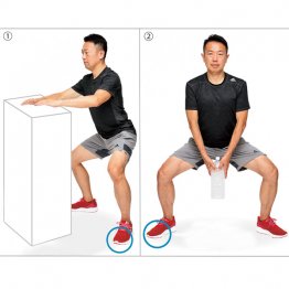(2)①の体勢から、4秒かけてゆっくり膝を伸ばして立ち、また4秒かけて戻ってカウント1回。背筋を伸ばした姿勢を維持することがポイント。20回で1セット、1日2セットが基本だが、増減は自由。1往復8秒×20回=160秒だから、1日2セットなら5分程度で済む。これが物足りなくなったら次の運動に移ろう。