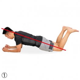 (1)スタートポジションは、両肘と両ももを床につけた腹ばいの姿勢。肘は肩の真下で立てるイメージで、肘を90度程度に曲げて安定させ、膝は上に曲げる。(2)ゆっくりと腰を持ち上げ、頭から膝までが一直線になったところで30秒キープ。1日2回が基本。肛門を軽く締めると腹横筋を意識しやすくなる。NGなのはお尻が突き出て、肘が肩より前に出る姿勢。腹横筋強化にならないので要注意。