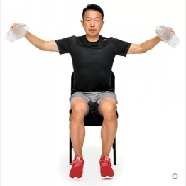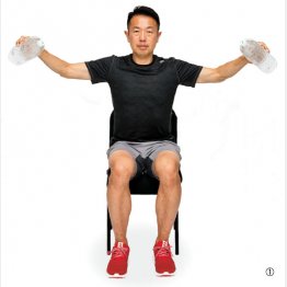 ①スタートポジションは椅子に座り、両手それぞれに中身が入った1・5~2リットルのペットボトルを持って腕を横に垂らした状態。このとき膝は腰幅に開き、足裏は床につけて胸を張って背筋を伸ばす。②姿勢を崩さず、鳥が羽を広げるようなイメージで4秒かけてペットボトルを肩の高さまで持ち上げる(写真①)。さらに4秒かけて①に戻って1回。20回を1セットとして、1日2セットが基本となる。所要時間5分20秒。これが物足りない人は次の運動を行う。