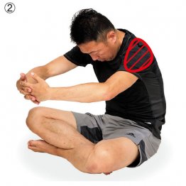 ①あぐらをかいて座り、体の前で両手の指を軽く組む。②息を吐きながら背中を丸め、肩甲骨を開くイメージで指を組んだまま腕を前方に押し出し、顔はヘソをのぞき込むように下げていく(写真(2))。背中と肩回りの筋肉が痛キモチよく伸びたところで30秒キープ。