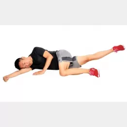 ①アダクションの応用で、上側の脚を伸ばし、下側の脚を手前に90度ほど曲げた状態からスタート。上側の脚を伸ばしたまま4秒で上げ、4秒で戻して1回。基本回数も同様。