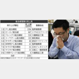 総合感冒薬の処方量は約4億1600万錠。しかも1包(錠)5円から7円と、いずれも低価格。処方金額は、すべて合わせてもわずか24億円。そのうちの約12億4000万円をPL配合顆粒(塩野義:幼児用を含む)が握っています。