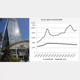 港区に金持ちが多いことは昔から知られていました。すでに84年時点で、足立区とは2倍の年収格差があったことが分かります。しかしその差はバブル期に一気に広がり、絶頂期の91年には、格差は現在よりも大きい594万円(港区962万円、足立区368万円)に達していたのです。