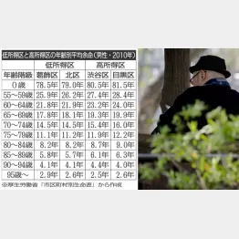 <表>は足立区に次いで低所得の葛飾区・北区と、高所得の渋谷区・目黒区の男性の平均余命をまとめたものです。中年までの平均余命の違いは、低所得区の現役世代の死亡リスクが、高所得区よりも高いことによるものです。しかし高齢になって平均余命差が縮んでくることは、高所得区の死亡リスクが年齢とともに低所得区を上回ってしまうことを意味しているのです。