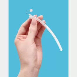 ナステントは直径4ミリ、長さ120ミリから145ミリまでのシリコーン製の管だ。長さは5ミリごとに6段階になっており、個々の人に合った長さのものを使う。右鼻用と左鼻用があり、空気の通りのいい方に挿入する。軟らかさはソフトとハードがあるが、ハードであっても、記者が触った感じでは、耳たぶくらいの軟らかさだった。