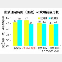 「健常な成人男性22~23人を被験者にしてミネラル入りむぎ茶と2種類の一般的なむぎを飲んでもらった後、一定量の血液が流れる時間を測定したところ、ミネラル入りむぎ茶のほうが血液流動性が高い、つまり、『ミネラル入りむぎ茶』には血液をサラサラにする血流改善効果があることが分かりました。体内で発生した熱は、血液によって皮膚に集められることでその熱を体外に放出し、血液の温度を下げることによって体内の熱を下げます。ところが、水分やミネラルが不足してしまうと血液がドロドロ状態になるため体内に熱がこもり熱中症になってしまいます。手軽にできる、〝浴室熱中症対策〟としては『ミネラル入りむぎ茶』を日常における点滴飲み(こまめな水分補給)と入浴前後にコップ一杯から500ミリリットルを目安に飲むといいでしょう」