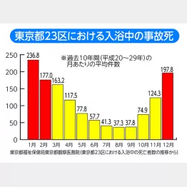 事実、東京都福祉保健局東京都観察医務院が発表したデータによると、東京23区における入浴中の事故死の10年間の平均件数は1月が236人で最も多く、以下12月197人、2月177人となっている。夏の7月が41人、8月が37人と2カ月間でも78人にすぎないことを見れば、いかに冬に集中しているかが分かるだろう。