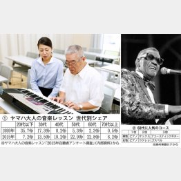 ヤマハ大人の音楽レッスンの世代別シェアを見ると、2015年時点で60代以上は29%。1999年には2・8%だったから、16年で10倍になった(別表①)。最高齢は92歳。シニア層で伸び率が高いのは男性というが、楽器演奏による健康効果が高く、交友関係も広がるからだという。