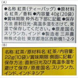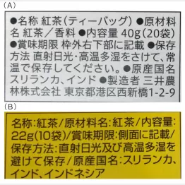 「同じ会社の紅茶の比較です。原産国はスリランカ、インドなどで同じですが違いは香料です。写真(A)は原材料名が紅茶であるのに対して写真(B)は紅茶/香料となっています。香料には天然のものと合成のものがあります。どちらが使われているかはわかりませんが、(B)は(A)に比べて茶葉の香りを豊かなものにするために香料が使われていると推測できます」