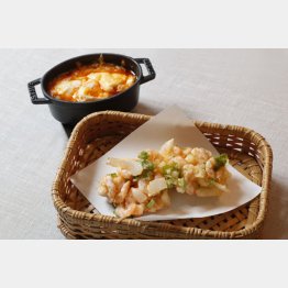 さて、今回の芝エビは身をかき揚げに、頭や殻は良いだしが取れるので、アメリケーヌソースにして温泉卵とグラタンにしてみました。アメリケーヌソースはフランス料理のソースの一種で、エビ独自の甘味やうま味が味わえるため、シーフードグラタンやシチューパスタに使ってもおいしくいただけます。